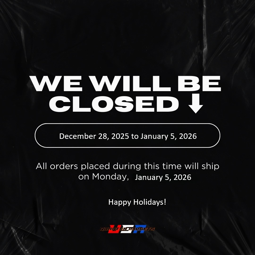 We will be closed December 28th through January 4th. All orders placed during this time will ship Monday the 5th Holiday Closure Notice